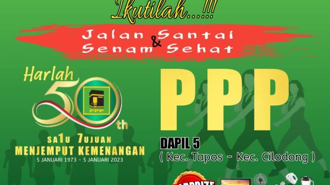 Masih dalam rangkaian Harlah Partai Persatuan Pembangunan(PPP),setelah mengadakan Jalan Santai di dapil Beji Cinere limo,kemudian Pancoran Mas,lanjut di Dapil sawangan Bojong Sari Cipayung, kemudian santunan Yatim di Dapil Cimanggis,dan Minggu kemaren senam sehat di dapil Sukmajaya, maka untuk hari Minggu ini,26 Februari 2023 giliran Dapil Tapos Cilodong yang mengandakan kegiatan. “Ya betul,Minggu ini kita akan hijaukan Tapos-cilodong,dalam tajuk kegiatan senam sehat dan jalan santai” ujar salah satu Bacaleg PPP Dapil Tapos-Cilodong Samsudin SE. Pria yang lebih sering dipanggil Bang Alloy ini menjelaskan bahwa acara akan dipusatkan di halaman Ruko D’ Estrella Rt 02/RW 06 kelurahan Sukamajubaru kecamatan Tapos Kota Depok. ” Yaa,acara berlangsung di situ,tepatnya di pertigaan Ciherang,perbatasan Sukatani dan sukamaju baru, masuk wilayah RT 02/RW 06 Sukamaju baru, dan kami akan berikan banyak hadiah Doorfrize untuk para peserta” ujarnya lagi.