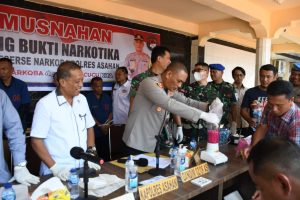 Pemusnahan barang haram tersebut dipimpin Kapolres Asahan AKBP Rocky H. Marpaung, S.H., S.I.K., M.H., dengan didampingi Dandim 0208/Asahan Letkol Inf Franki Susanto, S.E., Danlanal Tanjung Balai Asahan Letkol Laut (P) Aan Prana Tuah Sebayang, S.E., D.W.C., Dansub Denpom 1- 1/4 Kisaran Kapten CPM Pasaribu, Bupati Asahan diwakili Buwono Prawana, S.IP., M.Si., Ketua DPRD Kabupaten Asahan diwakili Syaddad Nasution dan undangan lainnya.