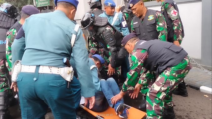 Paska bubarnya massa unjuk rasa, satu orang warga diamankan karena diduga sebagai otak penggerak massa dan mengalami luka ringan dibagian kepala dan dilarikan ke Balai Pengobatan Lanal Bandung.